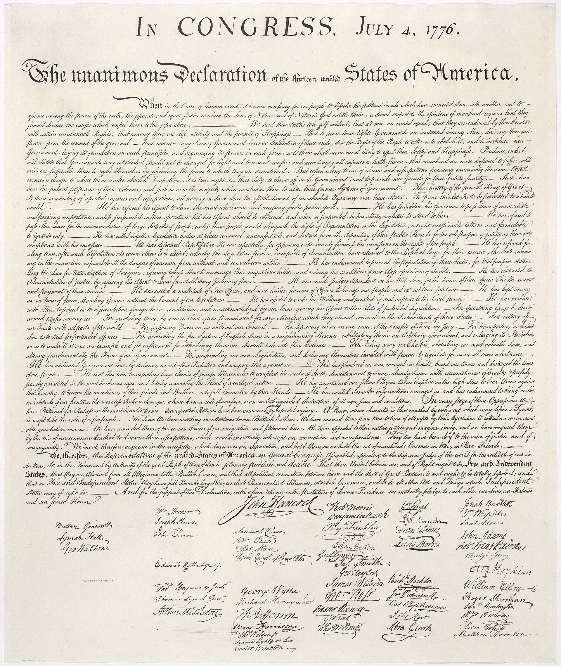 Facsímil de la Declaración de Independencia de EE.UU., reproducido por William Stone en 1823.